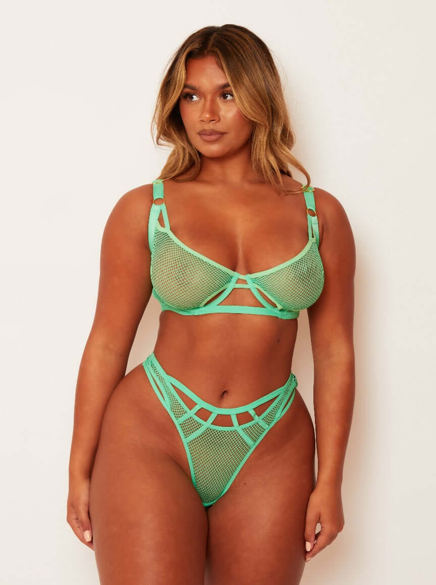 Make ‘em green with envy in the Aphrodite Set in Apple Green – a vibrant twist on this bestselling beauty. With cut-out demi cups, bold cage details, and structured underwire, this sheer fishnet fantasy is here to frame your curves and steal the spotlight.