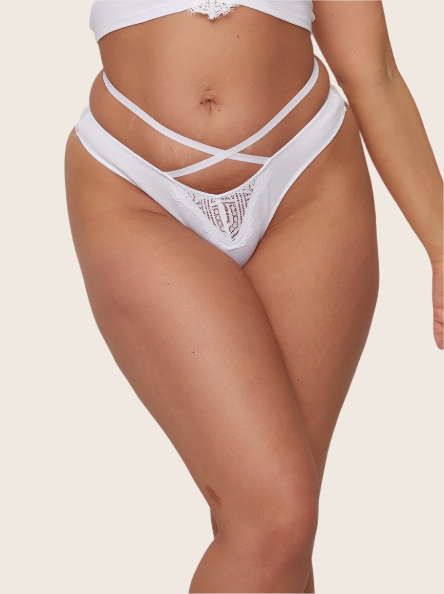 Meet the Aspen Thong – your new go-to when you want pretty meets powerful. In a crisp Ice White finish, this piece is all about embracing your curves with a flattering V-dip front, delicate lace panels, and a fit that’s both dreamy and daring.