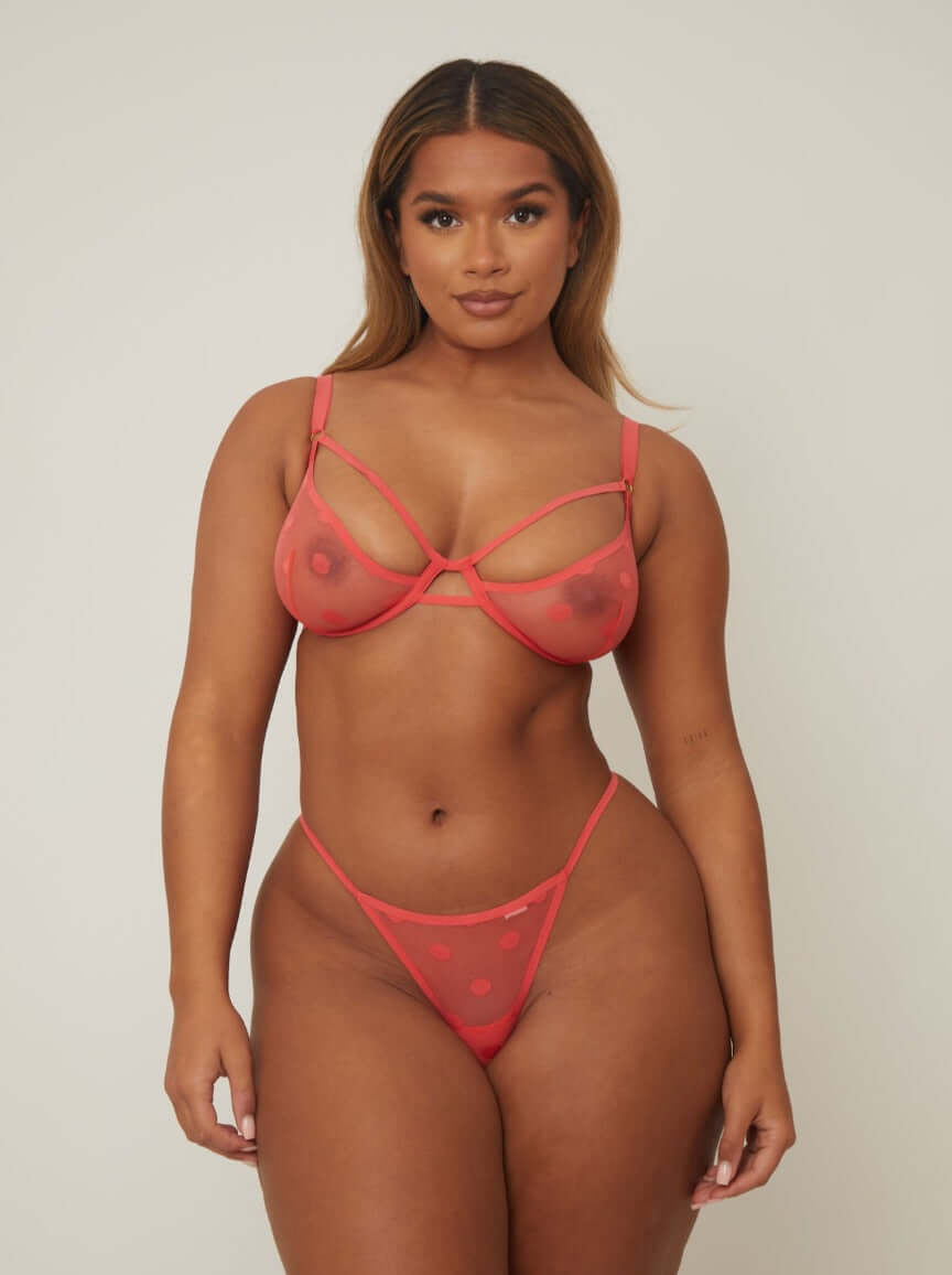 Meet the Brady Set in Persian Red—your next lingerie obsession 💋 This sultry underwired demi bra brings the heat with ultra-sheer spot mesh cups, a cheeky keyhole cut-out, and soft microfibre caging that traces your curves just so. Designed to highlight, not hide, she’s your go-to for that barely-there-but-still-banging look.