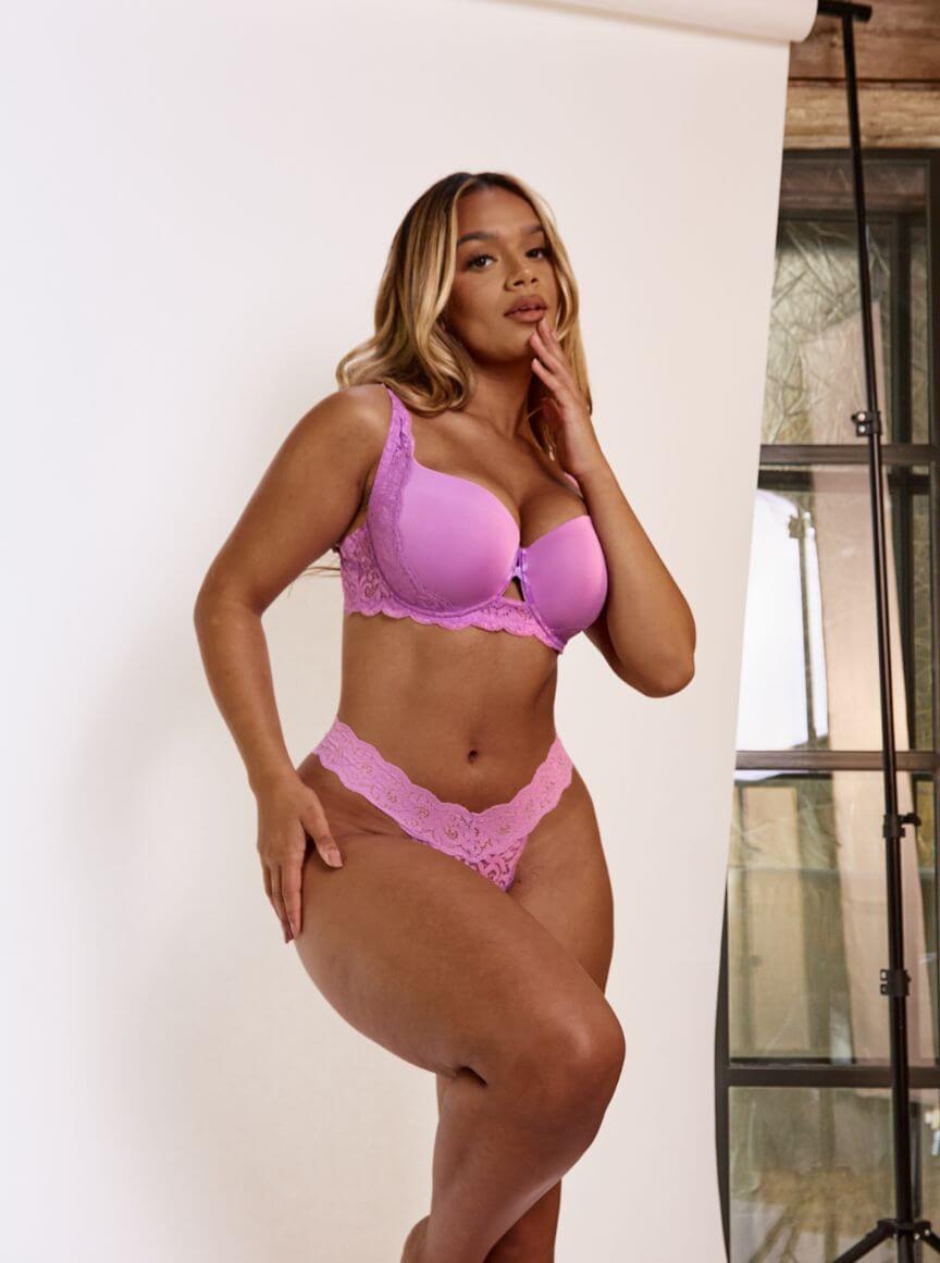 And let’s not forget the deets: dainty lace overlays, flirty heart sliders 💖, and a matching lace brief that’s soft, stretchy, and super flattering. All dipped in the prettiest Amethyst Orchid for that extra pop of sweet-sassy colour.