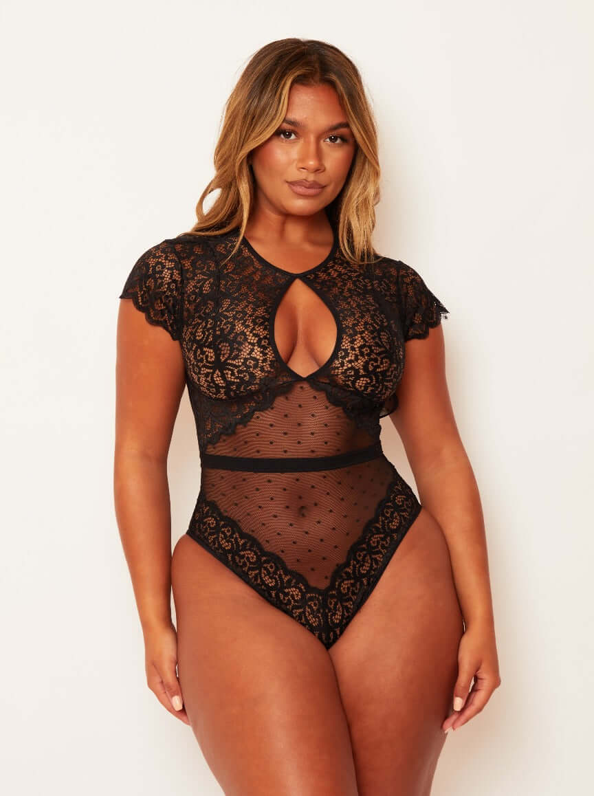 Meet the bodysuit that’s equal parts sultry and stylish. With sheer spot mesh and signature Tutti Rouge lace, she shows just enough to keep ‘em guessing. The crew neckline keeps it chic, while the open back turns up the heat. Add cap sleeves, a high-cut leg, and a relaxed, sensual fit—you’ve got yourself a showstopper.