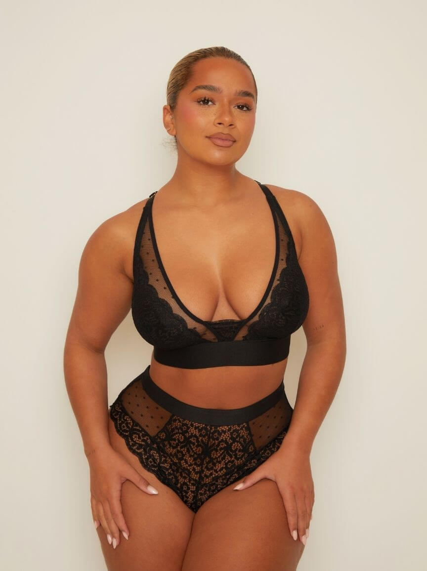 Turn heads in the Riley Set! This midnight black bralette looks and feels super fab with its full coverage, adjustable straps and supportive hook and eye fastening. Have eyes all over you in scalloped lace and spot mesh, and show your love with an adorable heart slider! Get ready to feel supported, secure, and oh so seductive.